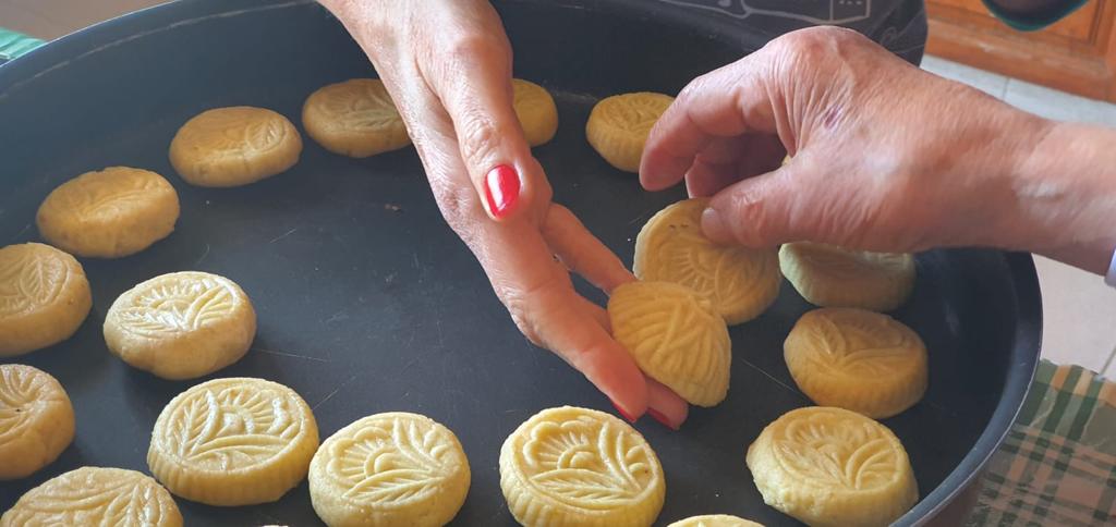 À l’approche de Pâques, les femmes se réunissent par groupes pour alléger la besogne. Et l’égayer. Parfois deux jours de travail par foyer: c’est long, fastidieux. Pâte et farce. Le plus long, rouler les boules à la bonne proportion. Les creuser, les fourrer à la main, l’une puis l’autre. Dans ce moule individuel en bois sculpté où la pâte se colle souvent. Ne pas les déchirer. Refermer, toujours sans trou. Puis taper énergiquement pour éjecter la pièce du moule avant la cuisson, sans l’écorcher. Les enfourner, les unes près des autres sur la plaque préalablement huilée. Et ce n’est pas tout. Chaque recette a son petit truc supplémentaire. Se retrouver à deux ou trois, pas plus: « On commence chez toi? Demain chez moi?Ça te va comme ça? »