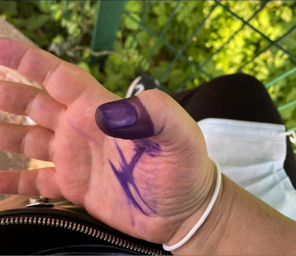Je tremperai mon pouce, je l’enfoncerai plus que nécessaire dans l’encre violette, la main si je pouvais. Ignorance de l’utilité de cette empreinte, élan de désespoir surtout. Je sortirai marquée, un peu ivre. Je publierai sur les réseaux la photo de mon doigt outrageusement encré, un texte à l’appui. Je réagirai aux posts de mes amis d’enfance. Pointer du pouce coloré notre affiliation éparpillée dans le monde. Ces doigts comme cailloux de Petit Poucet nous rappelant le chemin de la maison, l’impérieux retour au pays-maison. Baytna. Je me sentirai reliée.