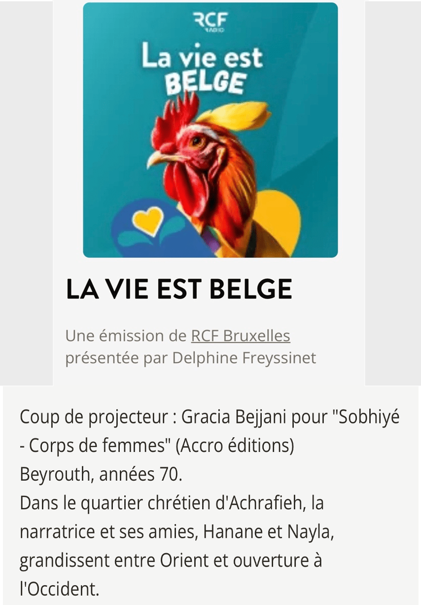 Gratitude pour l’accueil de Delphine Freyssinet et pour notre entretien du 26 mars sur RCF. La finesse et la profondeur de ses questions ont permis d’explorer Sobhiyé – Corps de femmes (Accro Editions) sous d’autres angles, avec une lecture d’une grande sensibilité.