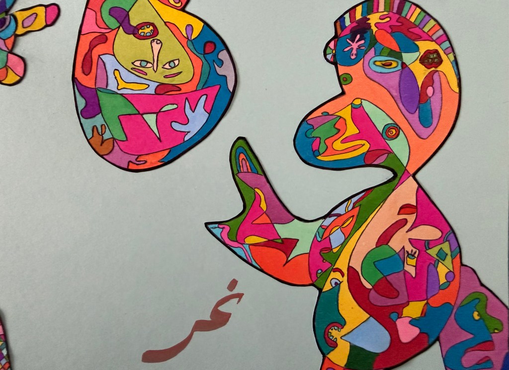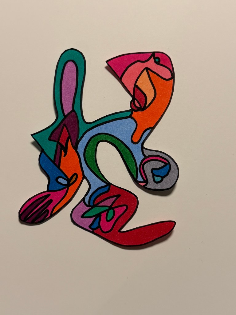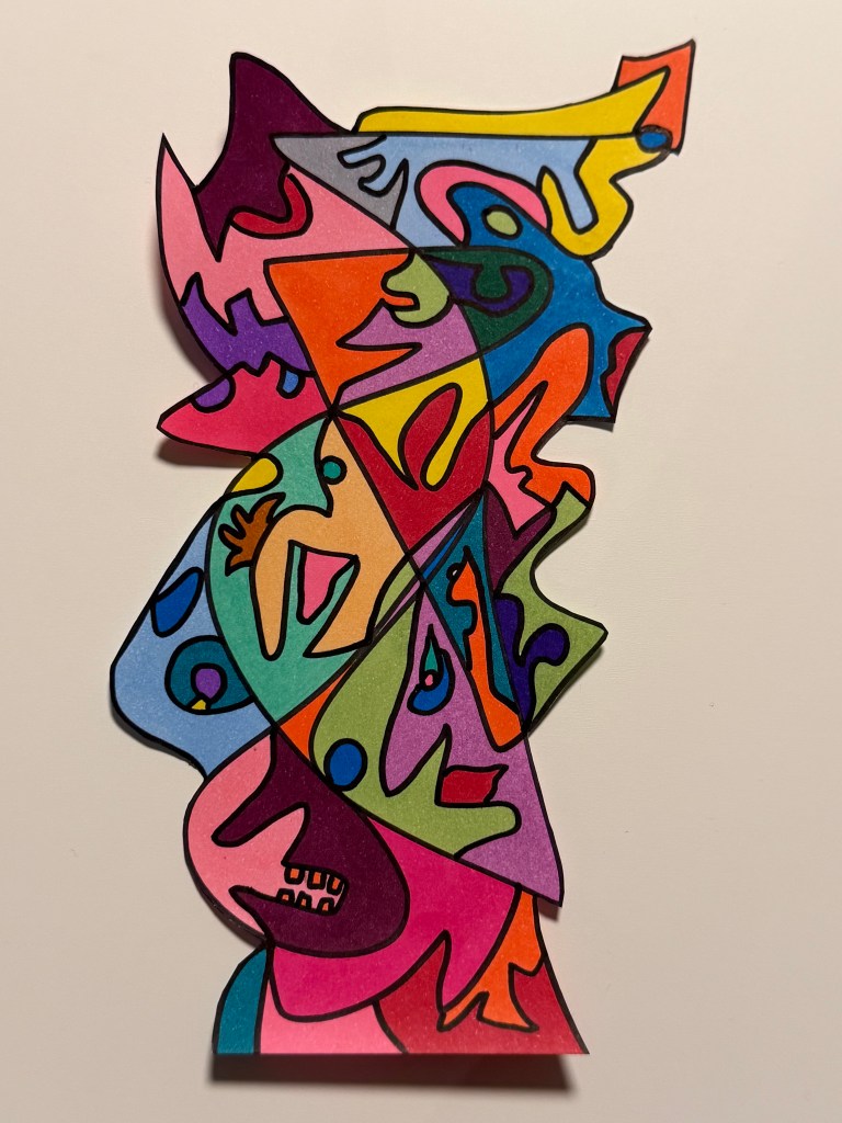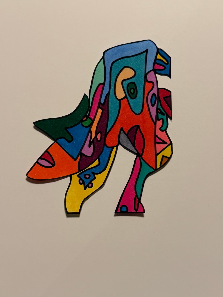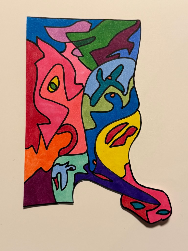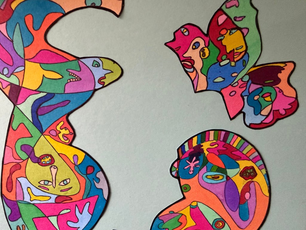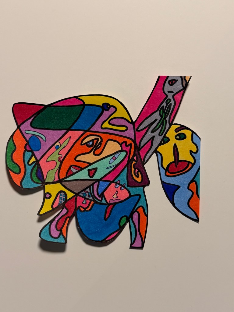 (dessin au bic, coloriage au feutre, contour en noir, découpage ciseaux)